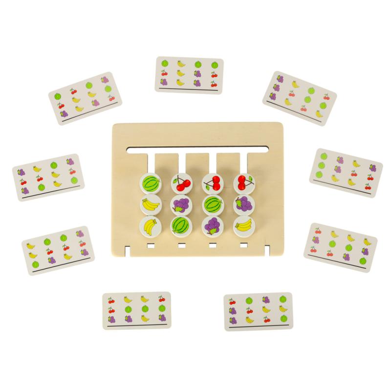 - Dwustronna tablica – jedna strona z kolorami, druga z owocami, umożliwia różnorodne warianty zabawy i nauki.