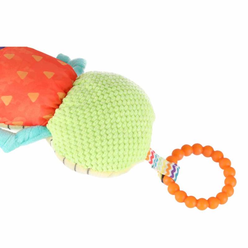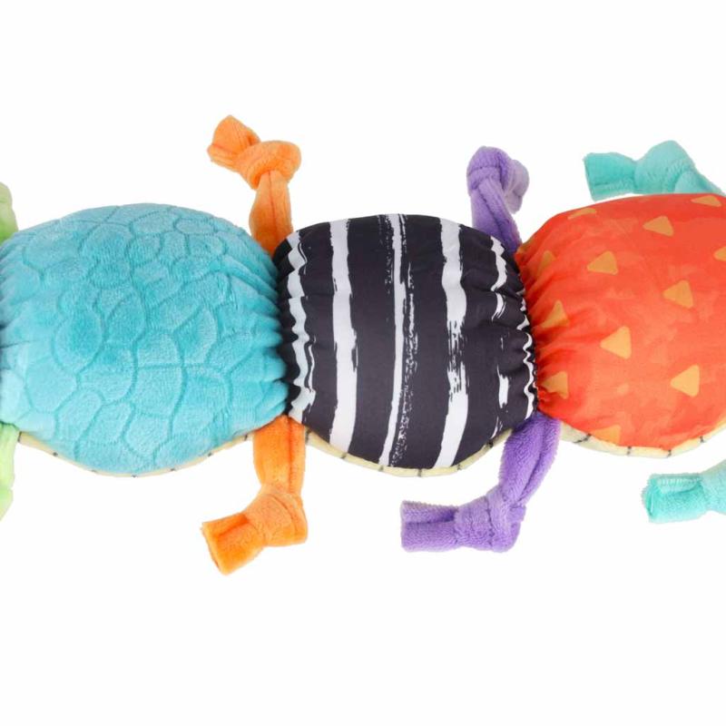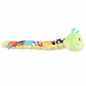 Gąsienica pluszowa 64 cm z melodyjką i grzechotką, wielokolorowa, z wszytymi 3x bateriami AG13 i elementami silikonowymi. Zabawka interaktywna dla niemowląt 0+ łączy guziki z melodyjką, piszczałkę, szeleszczący papier, grzechotkę i gryzak, wykonana z bawełny, PP i pluszu; waga 0,19 kg. Wymiary gąsienicy: długość 64 cm, szerokość 12 cm, wysokość z głową 11 cm, reszty ciała 5 cm; wymiary opakowania 25 × 21 × 10 cm. Funkcje sensoryczne i dźwiękowe wspomagają rozwój zmysłów i chwytność malucha.