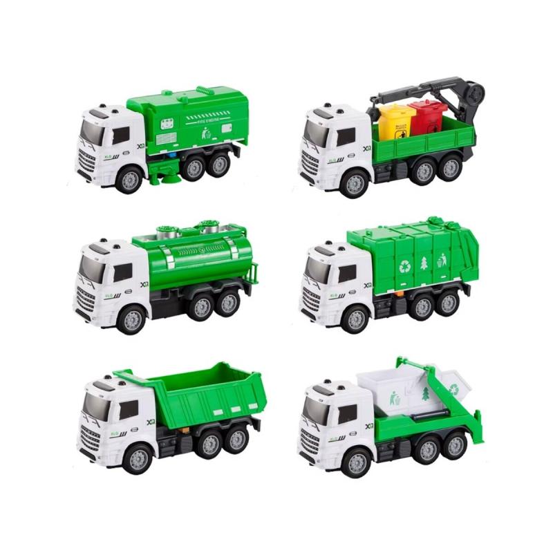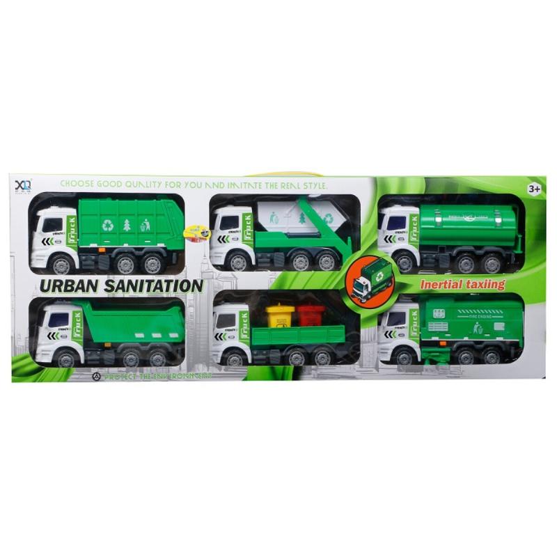 - Zawartość zestawu: zamiatarka, cysternę (beczkowóz), wywrotkę, śmieciarkę z dwoma koszami, śmieciarkę jednokomorową, ciężarówkę z otwartym kontenerem, oryginalne opakowanie