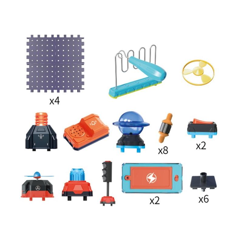 W komplecie znajdują się m.in. płyty fundamentowe do budowy podstawy, moduł zasilania, dioda LED, przełącznik, dzwonek, mikrofon oraz elementy ruchome jak wiatrak i frisbee. Wszystkie części są przemyślane, aby łatwo i bezpiecznie można było je łączyć oraz eksperymentować z różnymi konfiguracjami obwodów.