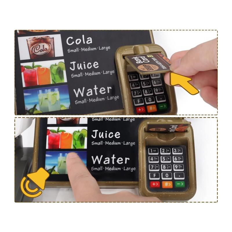 Kasa fiskalna posiada dźwięki oraz możliwość symulowanej płatności kartą za pomocą czytnika i dwóch dołączonych kart, co pozwala dzieciom ćwiczyć liczenie, wydawanie reszty i rozumienie transakcji. Całość wyposażenia — kubeczki, talerzyki, kawa i dodatki — buduje wiarygodny świat zabawy usługowej.
