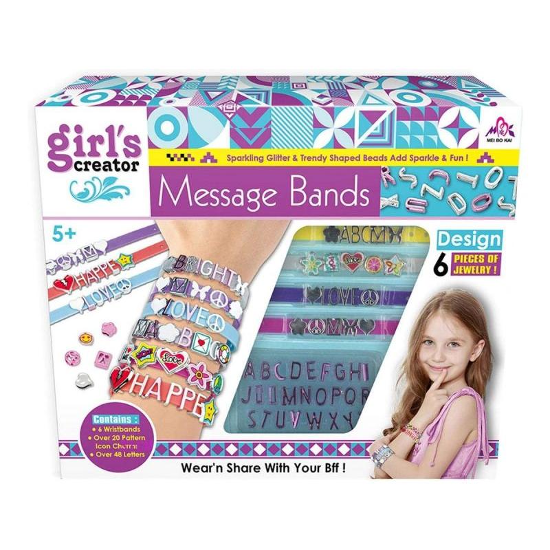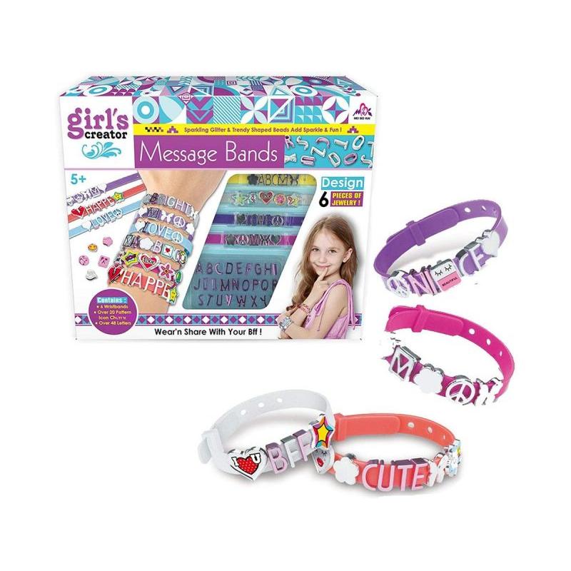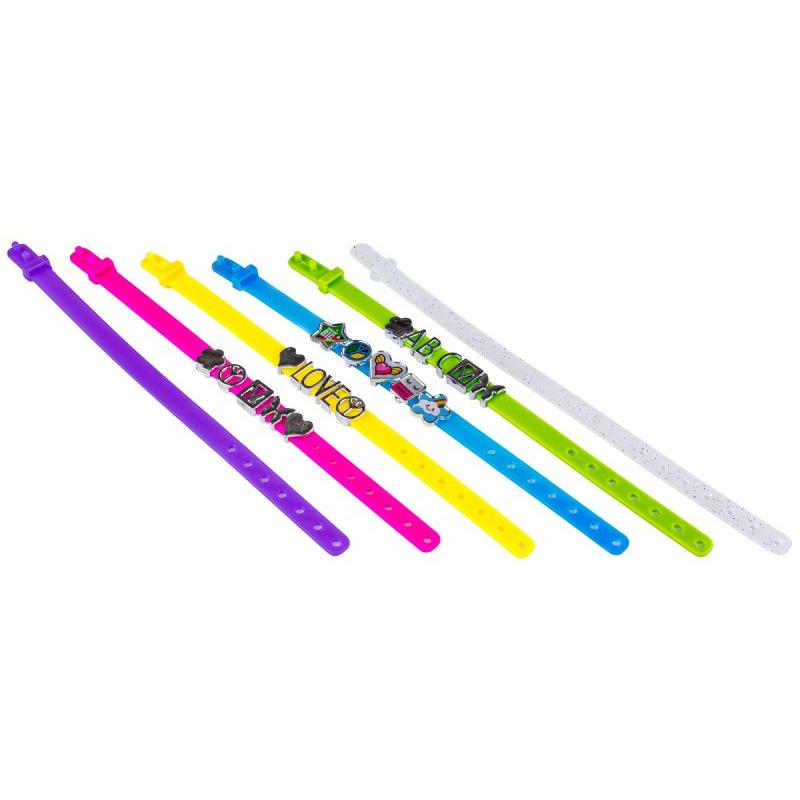 To przemyślana propozycja dla młodych projektantek mody — zestaw łączy w sobie gotowe elementy i dużą swobodę tworzenia: różnorodność kolorów pasków (biały brokatowy, fioletowy, żółty, niebieski, zielony oraz różowy) pozwala na komponowanie wielu kombinacji. Dwustopniowe zapięcie sprawia, że bransoletki będą dobrze trzymały się na ręce, a liczne oczka ułatwiają dopasowanie rozmiaru.