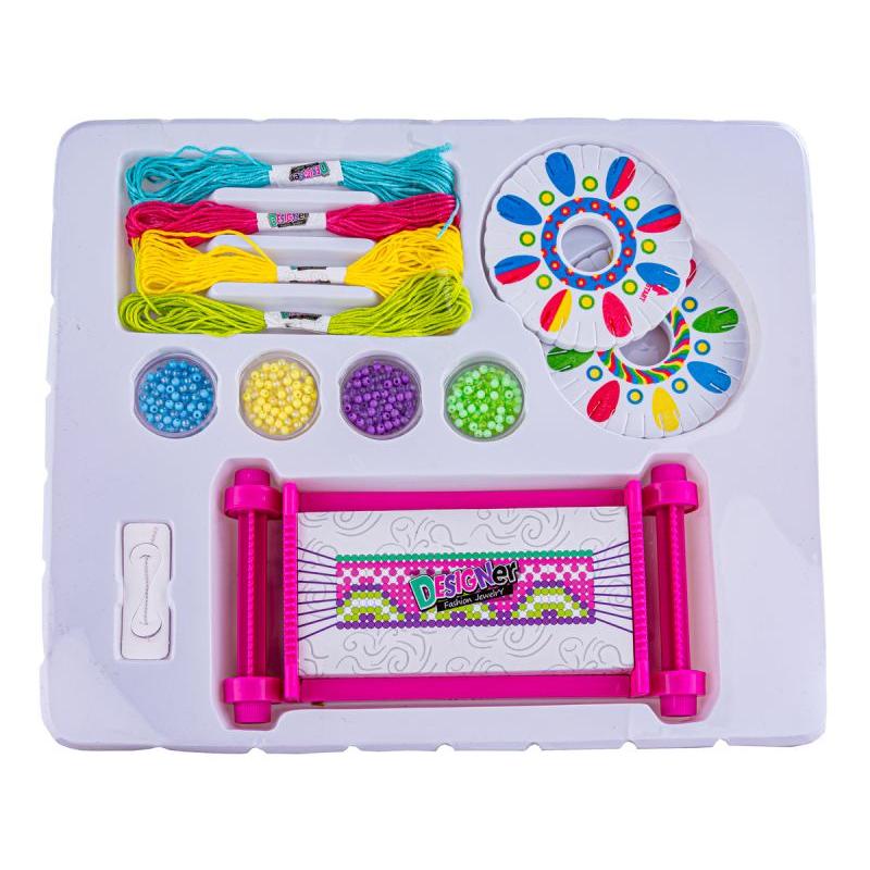 - Zawartość: sznurki w 4 kolorach, 2 okrągłe podkładki do przeplatania, kolorowe koraliki, krosno, skręcona elastyczna igła, obrazkowa instrukcja, oryginalne opakowanie