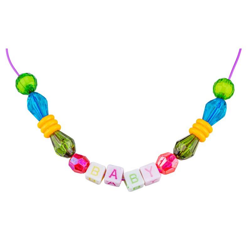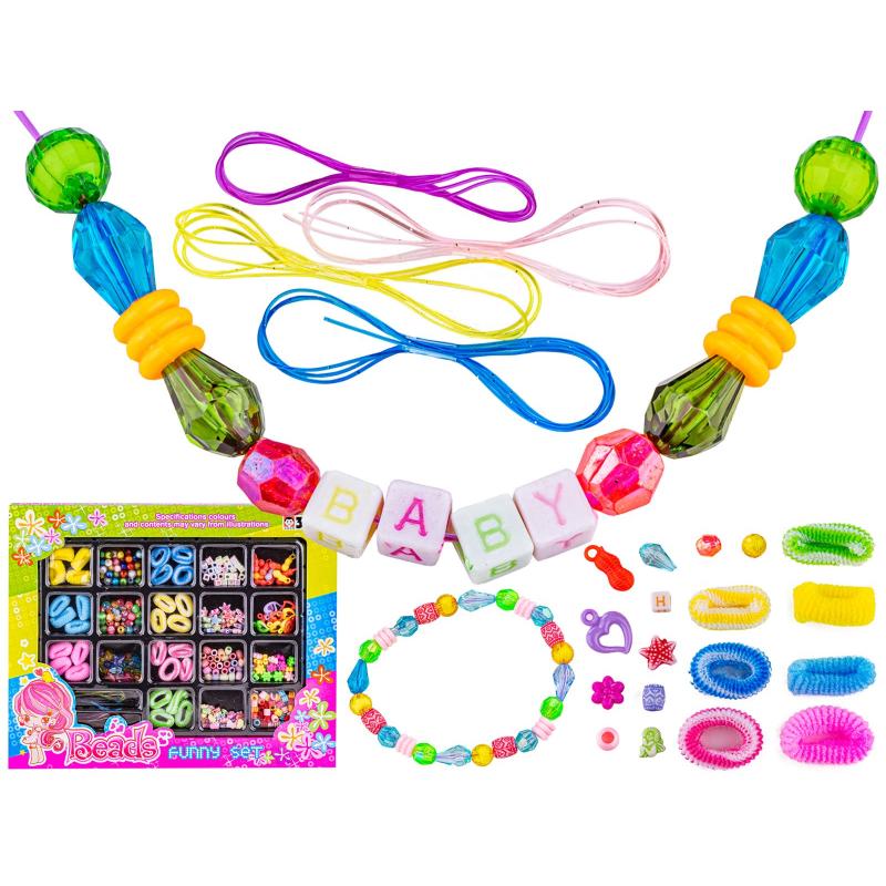 - Zawiera: mnóstwo kolorowych koralików w 11 kształtach (m.in. kostki z literkami, kwiatuszki, gwiazdki)