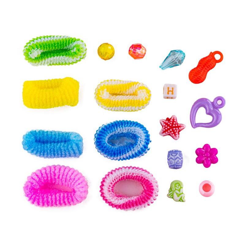 Zestaw zawiera kolorowe gumeczki, żyłki w 4 kolorach oraz szeroki wybór plastikowych koralików w 11 kształtach, co ułatwia łączenie różnych technik i szybką realizację pomysłów. Dzięki dołączonemu oryginalnemu opakowaniu wszystkie elementy są łatwe do przechowywania i zabrania w podróż — porządek i szybkość przygotowania do zabawy pozostają więc zachowane.