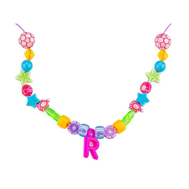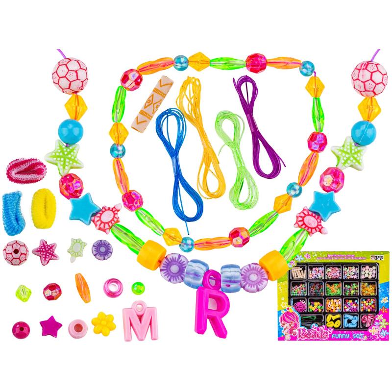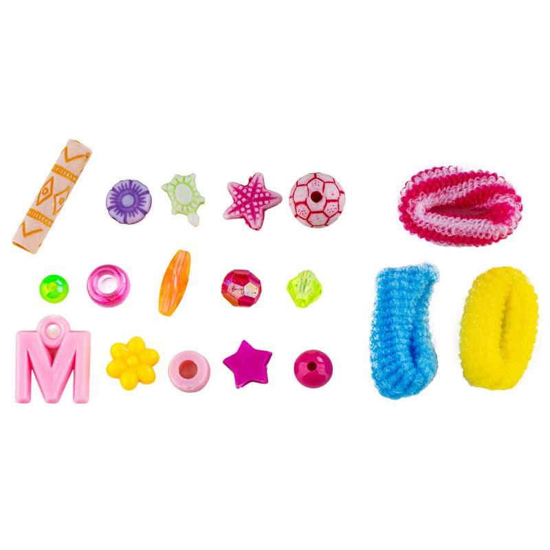 W jednym pudełku znajdziesz wszystko, co potrzebne, by zamienić pomysł w gotowy dodatek: kolorowe gumeczki, żyłki w 4 kolorach oraz mnóstwo plastikowych koralików w 15 różnych kształtach — między innymi literki, kwiatuszki i gwiazdki. Elementy są na tyle duże i wyraziste, że łatwo je nawlekać, a średnica pojedynczej kuleczki wynosi 11mm, co ułatwia pracę nawet najmłodszym użytkownikom.