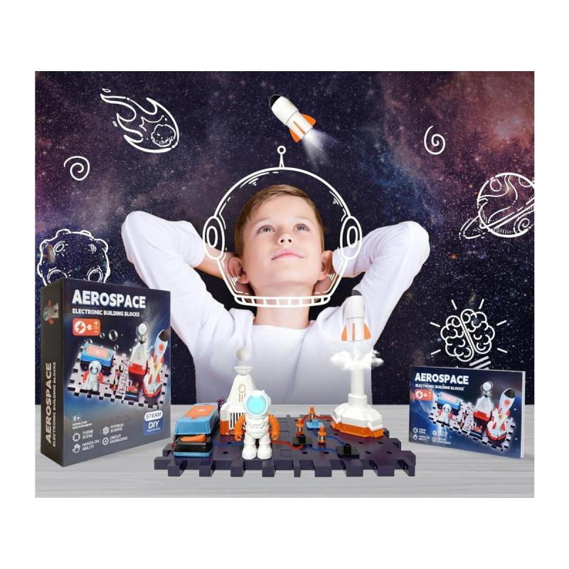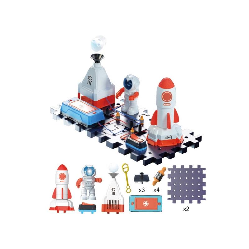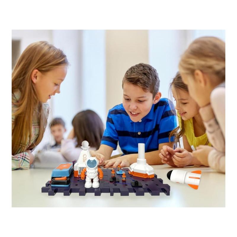 W opakowaniu znajdują się modułowe klocki do zbudowania podstawy bazy, figurka astronauty, rakieta oraz dmuchawa z piłką do lewitowania — po złożeniu elementy poruszają się i świecą, a niektóre części można nawet wystrzelić niczym małą rakietę. Zestaw zawiera również elementy potrzebne do skonstruowania prostego obwodu elektronicznego, dzięki czemu dziecko poznaje praktyczne zasady przepływu prądu i działania układów. Instrukcja prowadzi krok po kroku przez montaż i uruchomienie, co ułatwia samodzielną pracę nawet młodszym użytkownikom.
