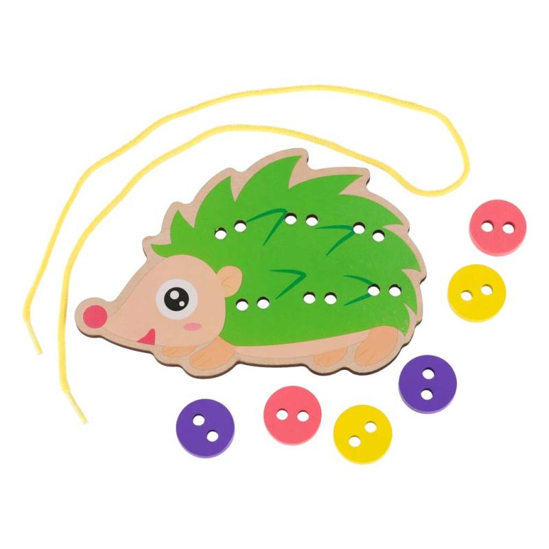 Ten uroczy jeżyk wraz z guzikami i sznureczkiem to idealna propozycja dla najmłodszych, którzy chętnie ćwiczą umiejętności manualne. Żywe, nasycone kolory elementów przyciągają uwagę i zachęcają do dłuższej zabawy, a sam proces nawlekania i mocowania guzików wspiera koordynację ręka-oko oraz cierpliwość.