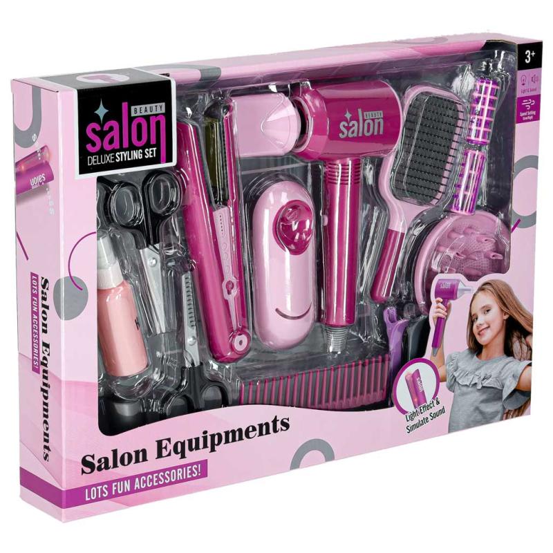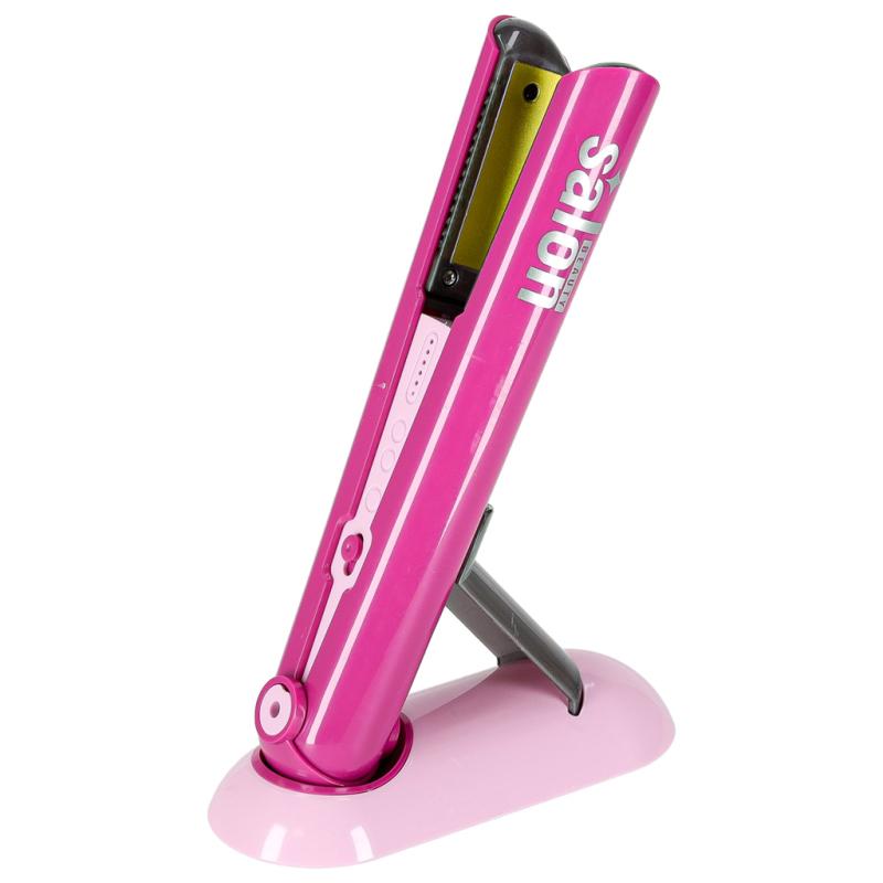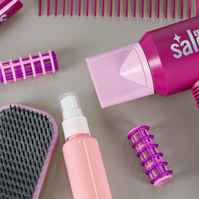 Prostownica w zestawie również świeci i wydaje dźwięki po naciśnięciu, co zachęca do odgrywania scenek stylizacji włosów w domowym salonie. W zestawie znajduje się także wygodna podstawka do prostownicy, szczotka, grzebień oraz nożyczki do cięcia i degażowania – oczywiście w wersji bez ostrzy, zapewniając bezpieczeństwo najmłodszych.