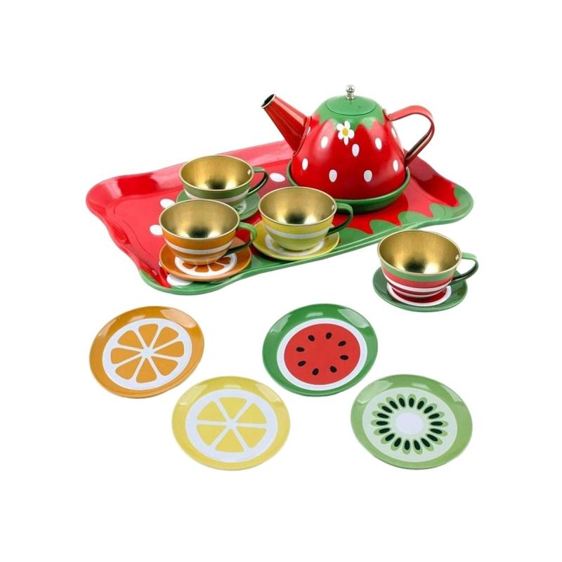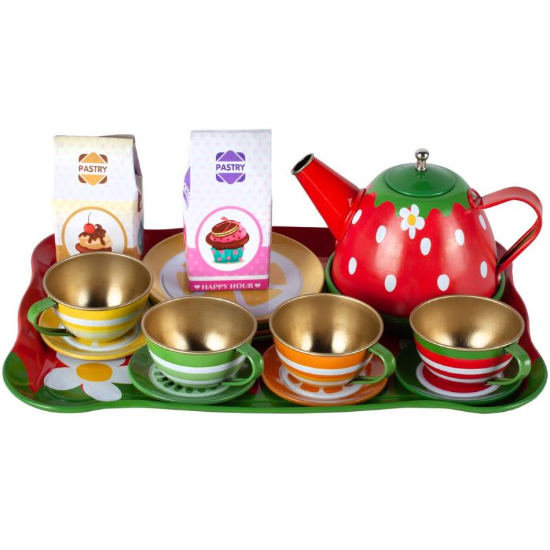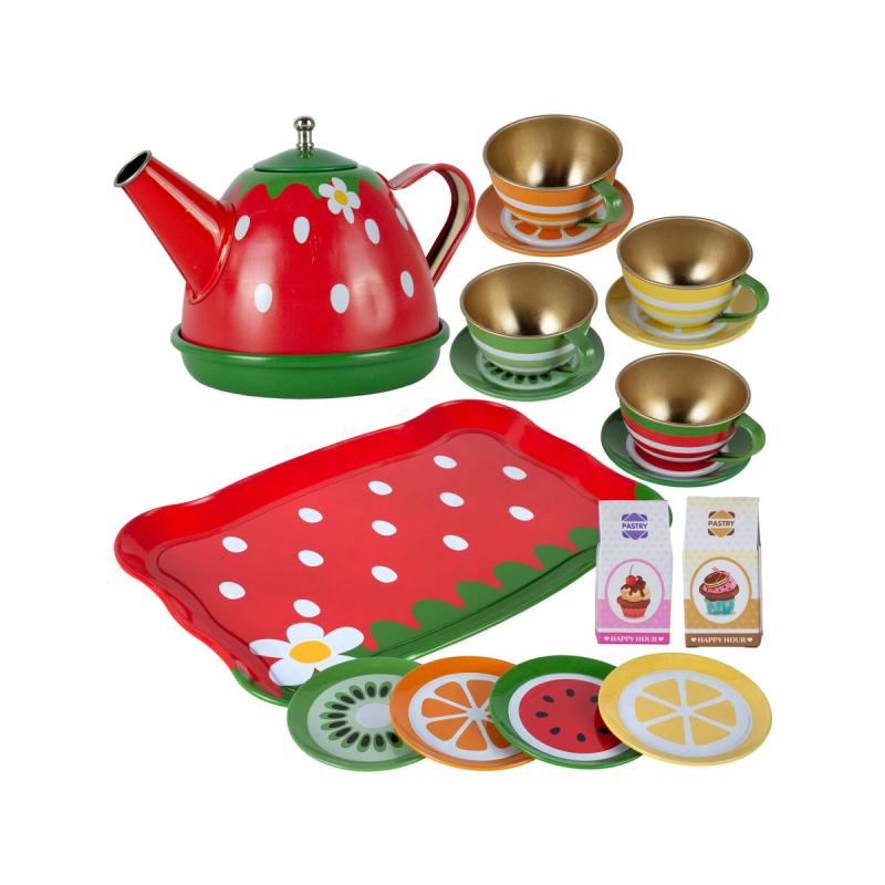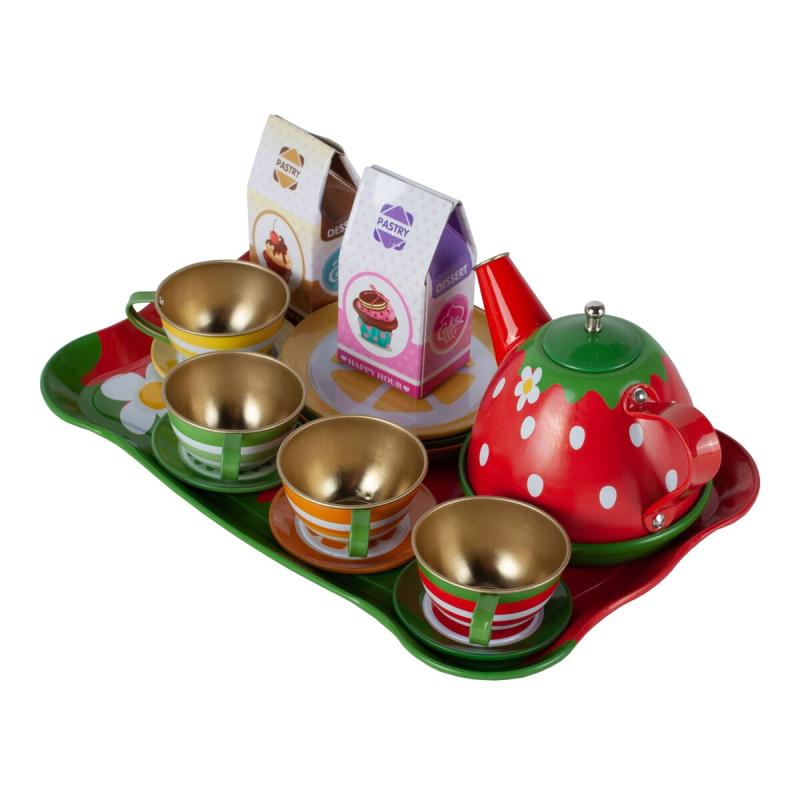 W skład zestawu wchodzą elementy metalowe, co wpływa na ich trwałość w porównaniu do typowych plastikowych zabawek. Tacka, czajniczek, filiżanki, spodki i talerzyki cechuje staranne wykonanie oraz żywa kolorystyka, która przyciąga uwagę i ułatwia angażowanie się w zabawę. Metalowe elementy są solidne i lepiej znoszą intensywne użytkowanie, a kartoniki z deserami dodają zabawie autentycznego charakteru.