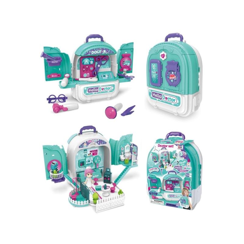 Zestaw Lekarski 3w1 plecak-walizka domek dla lalek — dwustronny plecak otwierany z dwóch stron, zestaw akcesoriów medycznych i lalka; opakowanie ok. 33 × 24.5 × 14.5 cm, lalka ok. 8.8 × 4.3 cm, dla dzieci powyżej 3 roku życia. Zestaw zawiera termometr, strzykawkę, otoskop, imitację EKG i rentgena oraz mini kranik do dezynfekcji dłoni, a także mebelki przychodni i lalkę pielęgniarkę. Wszystkie elementy wykonano z bezpiecznego tworzywa, bez ostrych krawędzi, z certyfikatem CE. To praktyczna zabawka edukacyjna, która rozwija koordynację manualną, empatię i oswaja dziecko z wizytą u lekarza.
