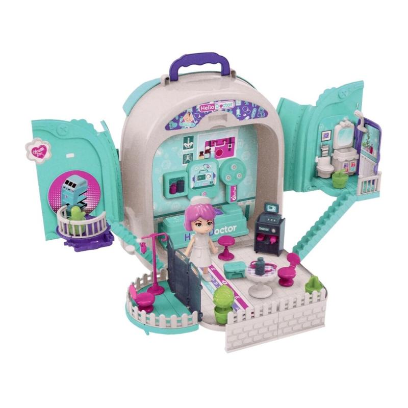 - Elementy w zestawie: plecak dwustronny, szelki do plecaczka, wyposażenie małego lekarza, akcesoria i mebelki przychodni, lalka, oryginalny kartonowy blister