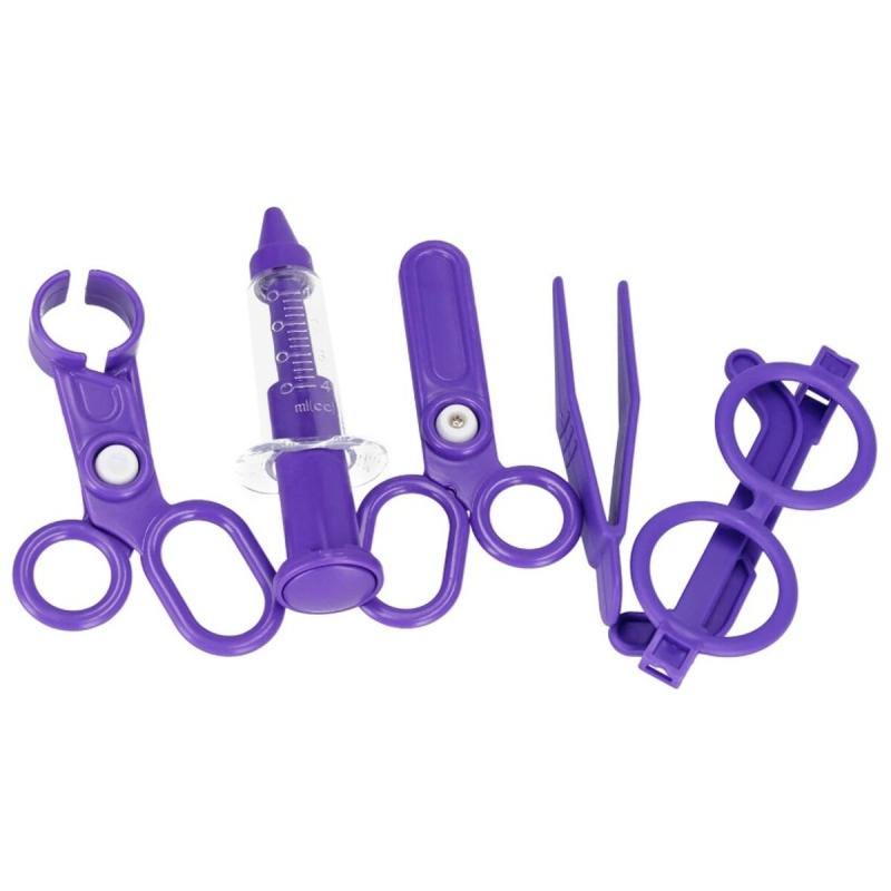 - Wyposażenie medyczne (imitacje): EKG, rentgen, mini kranik do dezynfekcji, termometr, strzykawka, otoskop, pęseta, 2 rodzaje nożyczek, okulary, lusterko