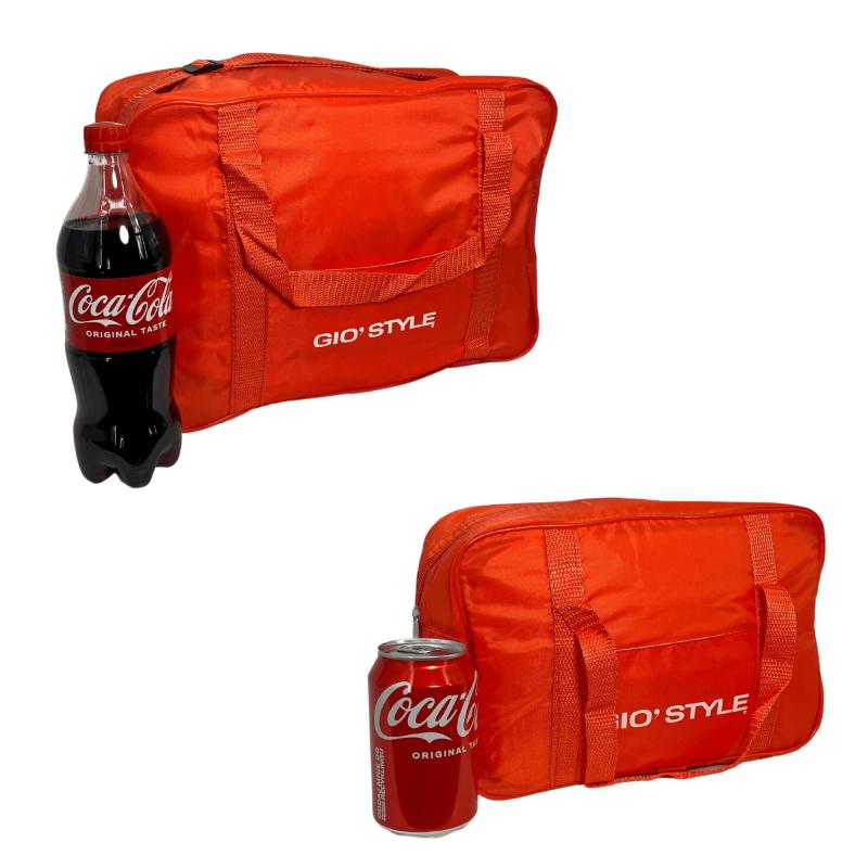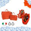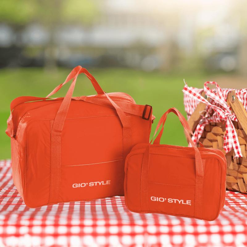 Zestaw toreb Kamai Gio Style 24L i 7L w kolorze pomarańczowym to dwie torby termiczne wykonane z trwałego poliestru 70D z izolacją z 5 mm pianki polietylenowej. Większa torba ma pojemność 24 l i wymiary 40,5 × 19 × 28 cm, mieści 8 butelek 850 ml. Mniejsza o pojemności 7 l, wymiarach 29 × 11 × 19 cm, pomieści 8 puszek 330 ml. Obydwie wyposażone są w otwarcie w kształcie litery U, ułatwiające pakowanie, oraz wygodne uchwyty. Zestaw jest bezpieczny w kontakcie z żywnością, zaprojektowany przez włoską markę Gio Style i nadaje się na pikniki, zakupy i wycieczki.