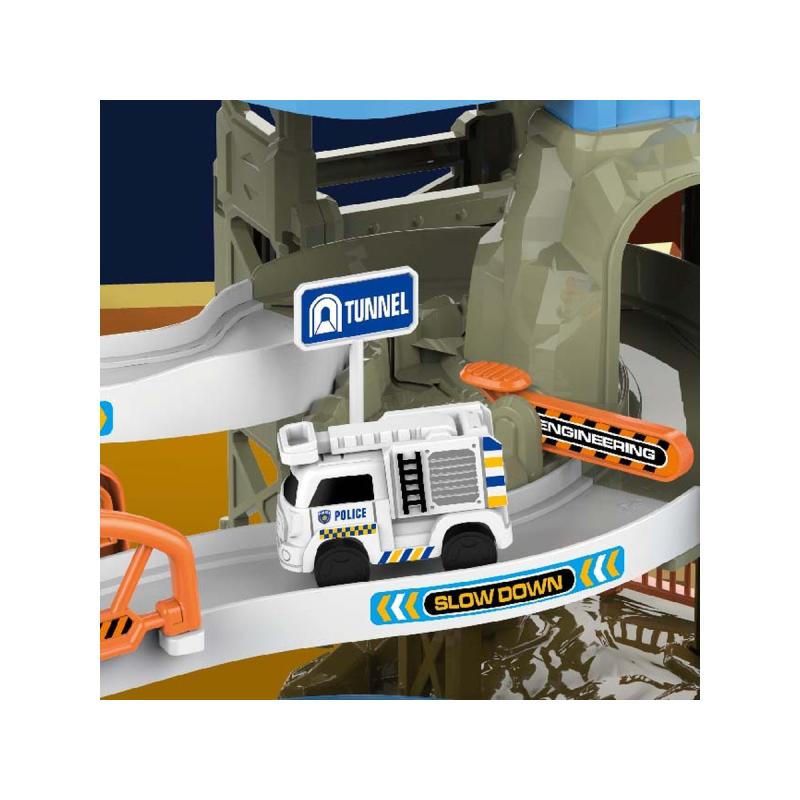 - Elementy: wielopoziomowy tor, elektryczny podjazd, zjazd z windą, samochodziki, mini pociąg, akcesoria drogowe