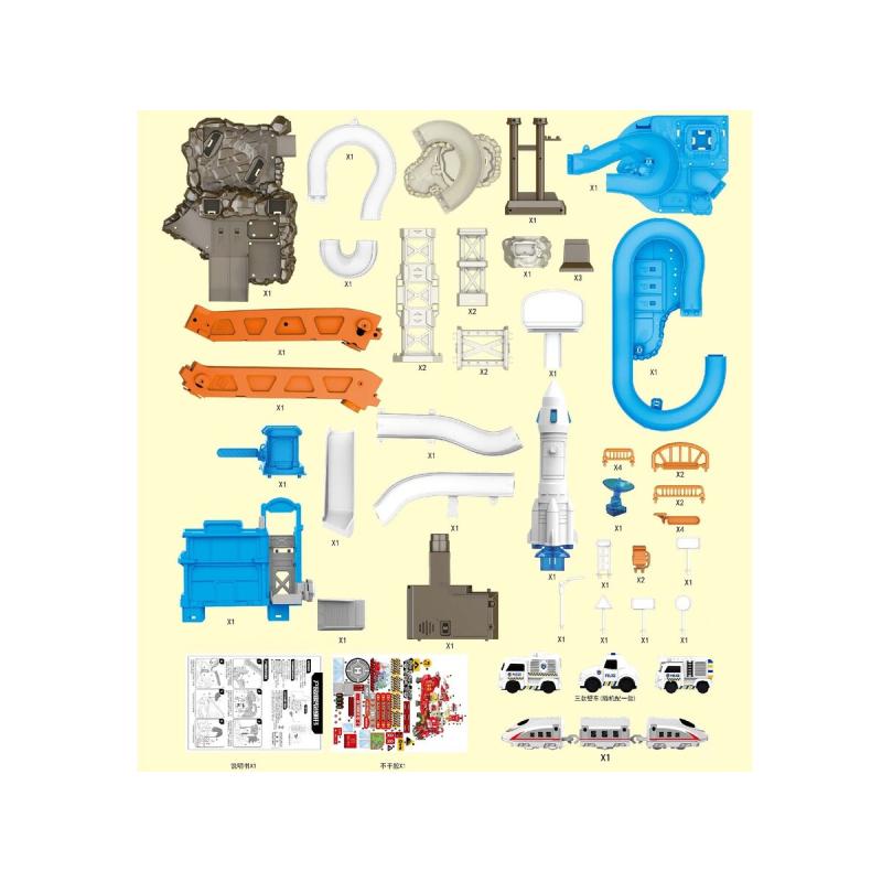 Zestaw zawiera: wielopoziomowy tor samochodowy z rakietą, samochodziki i pociąg, liczne akcesoria (m.in. znaki drogowe, dystrybutory paliwa, rogatki), obrazkową instrukcję składania oraz oryginalne opakowanie. Dzięki dołączonej instrukcji montaż przebiega sprawnie, a oryginalne opakowanie ułatwia przechowywanie i transport.