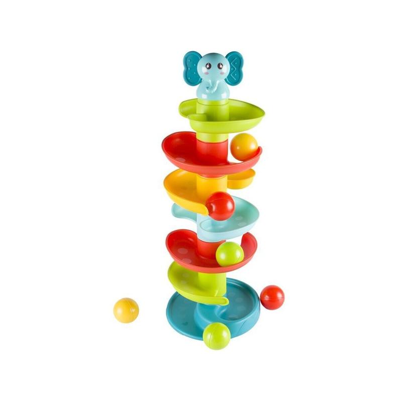 Zjeżdżalnia Kulodrom 47 cm, piłeczki Ø 4,5 cm, 6 sztuk — kolorowa wieża z zakręconym torem, stymuluje zmysły i ciekawość malucha. Konstrukcja z kontrastujących elementów przyciąga wzrok, a każda piłeczka pełni rolę grzechotki, co wzmacnia doznania słuchowe i wizualne; elementy są łatwe w montażu i bezpieczne w dotyku. Produkt wykonano z atestowanych materiałów, posiada certyfikat CE, w zestawie segmenty zjeżdżalni i oryginalne opakowanie; wymiar słonika na wieży ok. 9 × 5 × 6,5 cm, przeznaczona dla dzieci powyżej 18 miesiąca. Zabawa rozwija zdolności manualne, koordynację i rozpoznawanie kolorów podczas codziennej aktywności.