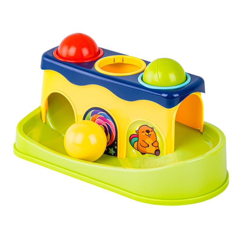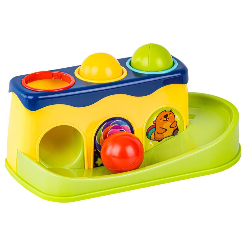 Każdy z otworów stawia delikatny opór, dzięki czemu piłeczki nie wpadają za szybko a dziecko musi dostosować siłę uderzenia.