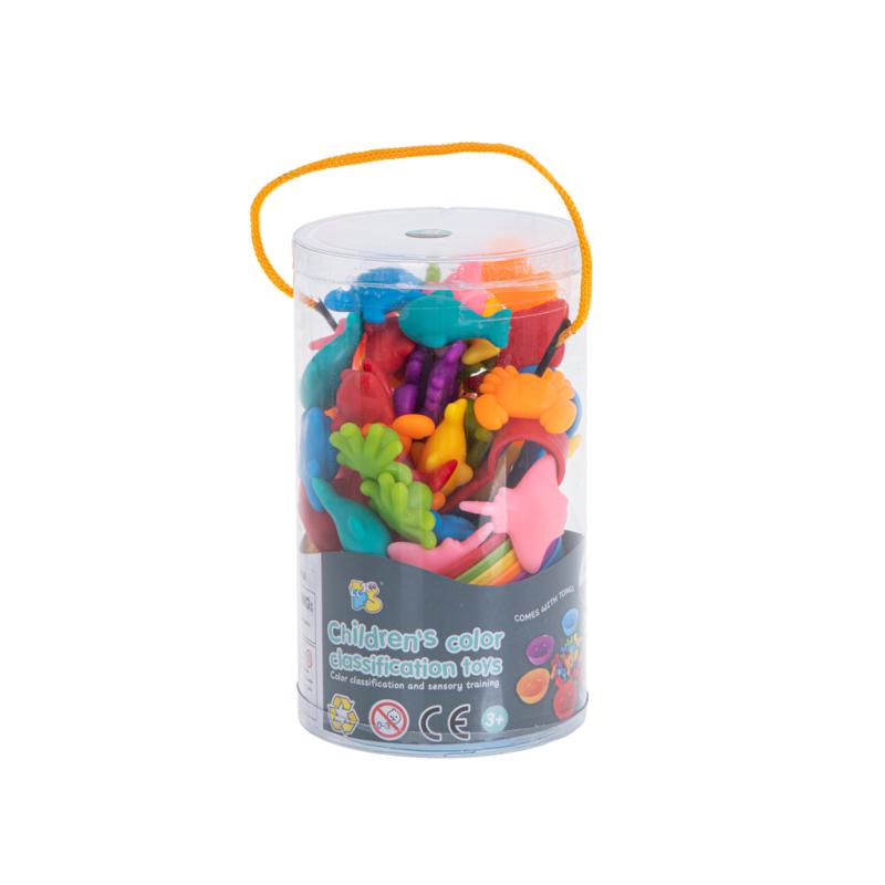 W skład zestawu wchodzą: 6 kubeczków, 2 szczypce oraz 36 kolorowych zwierzątek, które można liczyć, sortować i grupować według barw. Kubeczki o wymiarach 8 cm x 4 cm ułatwiają przechowywanie elementów, a szczypce o długości 9,5 cm doskonalą koordynację manualną i precyzję chwytu.